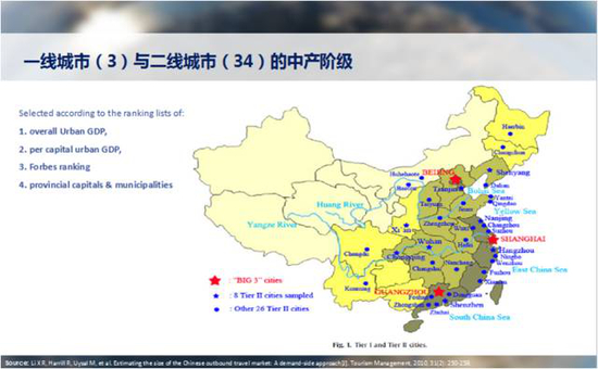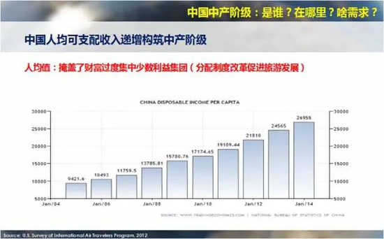 特别是中国改革开放三十多年,在共产党领导下,把无产阶级变成了中产阶级,共产党一大功劳是把无产阶级变成了中产阶级,同时自己也从无产阶级政党变成了中产阶级政党。但是官方没有这么说,我只是这么评估的,这个过程当中应该说中产阶级是未来中国旅游发展最主要动力。所有的我们在座的政府部门、行业研究者可能都是这么看。当然“中产阶级”这个词比较敏感,我们注意到中央政府文件中很少用“中产阶级”这个概念,多数是用“中等收入家庭”、“中产阶层”等同义词代替,是不是因为“中产阶级”这个词被美帝用过了,所以我们不能用了?实际上没关系,很多词可以通用,比如说,哈尔滨很cool,可以理解为哈尔滨很冷、很炫酷。那这个也是一样的道理,零下40度就是零下40度,所以大家可以用中产阶级,也可以用中产阶层,也可以用中等收入家庭。爱怎么用怎么用,意思是一样的。