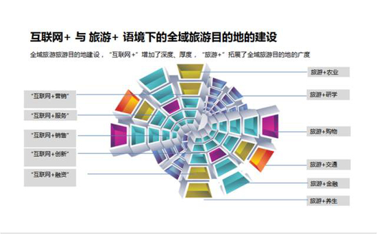 那么对一个旅游地和旅游城市怎么管理?我觉得是这样的,就是说,全域旅游要靠智慧,第一是旅游+和互联网+,这两个车轮一起驱动,而不是单独一个轮,旅游+互联网+影响着旅游业态和体验,旅游目的地建设也要在旅游+语境下进行,需要寻找与城镇化、工业化、农业现代化、信息化、生态化之间的联系。