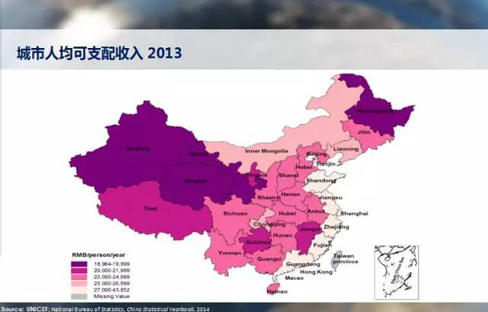 中国中产阶级形成过程中,有很多不平衡,比如城乡不平衡,城市和乡村应该说是非常大的不平衡,大家可以看出来,人均可支配收入,2013年东部沿海从山东、江浙一直到广东,这是比较有钱的地方,从一线城市北上广以及34个二线城市是中国中产阶级最集中的地方。所以,这是未来旅游需求比较集中的地方,但是一二三线城市的出游能力各不相同,中产阶级越集中的地方就是旅游企业要为他们服务的地方。人均收入最高的城市上海、苏州、杭州、宁波、北京、绍兴、广州等等,可以看出来长三角是最集中的,所以,如果能够把上海人弄高兴了,你就赢了。