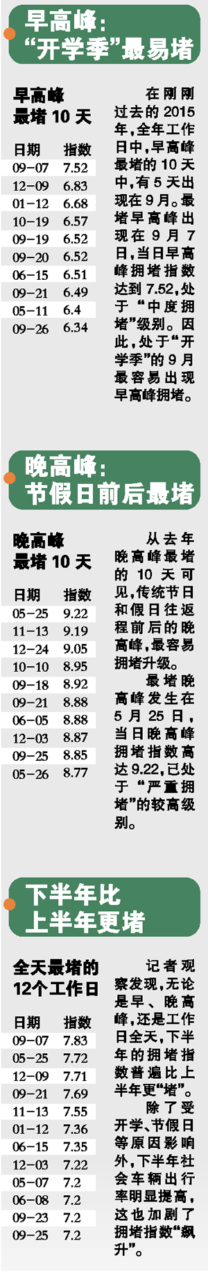 记者梳理了2015年TPI数据,为你奉上一份“解堵避峰指南”。在2016年,当你遇到下面这些易发拥堵的工作日,请尽量乘坐公共交通工具吧!