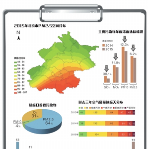 过去这一年,北京通过调整产业、优化能源结构等举措加大空气污染治理力度,新公布的数据显示:2015年北京PM2.5平均浓度为80.6微克/立方米,较2014年下降了6.2%,超额完成全年下降5%的目标。此外,2015年本市空气质量达标天数186天,占全年天数的51%。