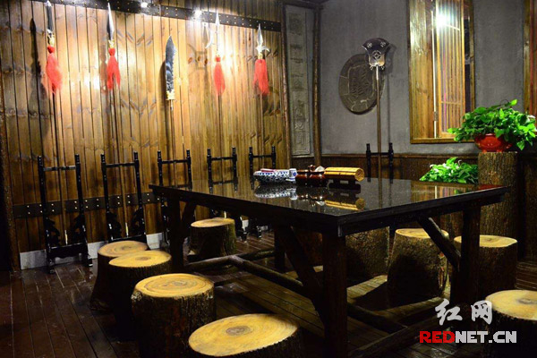 刻着年轮的木桩、一闪一闪的红灯笼、瓷杯、令牌、16种口味的古法酿制糯米酒,卤牛肉、凉拌红薯、拍黄瓜十多种老长沙最传统最地道的湘味卤菜。