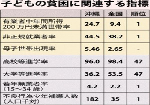 中新网1月7日电日本新华侨报6日刊文称,1月4日,日本山形大学副教授卢室健作公布了一项调查数据:2012年冲绳县无法保证最低生活水平的“绝对贫困率”达到34.8%,而未满18岁的“儿童贫困率”更是达到37.5%。种种数据都表明,日本47个都道府县中,冲绳县是最贫困的县20多年里,冲绳一直是日本最贫困的地区之一。资源等各方面条件并不算差的冲绳县,为何如此贫困?