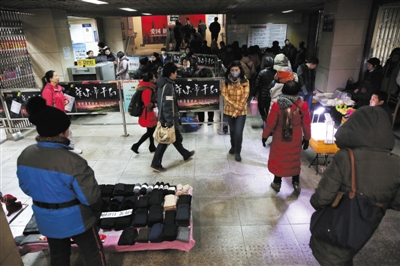 1月6日15时10分许,20多米长的通道两侧,摆了20多个摊位,挤占了通道近一半宽度。通道两头,有六七个小摊,分别卖玉米、手套、袜子、帽子、鞋垫等。其中一个卖护腿的摊位,大小近2平米,支在B口闸机外侧,还占据了部分通道台阶。