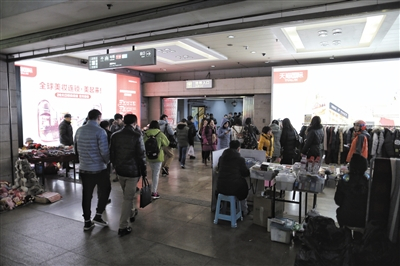 1月6日,国贸站通往银泰商场的通道,两旁的摊位使通道缩窄一半。