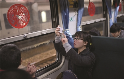 红红的窗花给列车增添了不少年味。