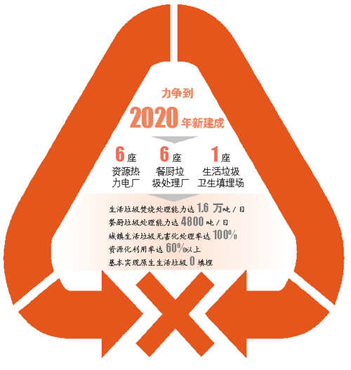 广州市力争到2020年,新建成6座资源热力电厂、6座餐厨垃圾处理厂和1座生活垃圾卫生填埋场,生活垃圾焚烧处理能力将达到1.6万吨/日,餐厨垃圾处理能力达到4800吨/日,城镇生活垃圾无害化处理率达到100%,资源化利用率达到60%以上,基本实现原生生活垃圾零填埋,全面化解“垃圾难题”困局。