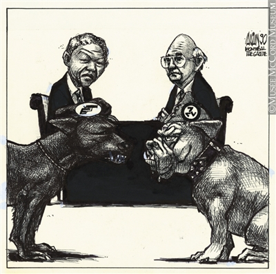 这是一幅表现德克勒克与曼德拉谈判的漫画,双方支持者之间的深层不信任,连谈判桌旁的两只小狗都有所表达。