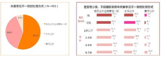 调查数据显示,当夫妻双方意见不一致时,超过5成夫妻会相互让步达到意见一致,而有38%的夫妻会是丈夫让步。而是否选择让步,与是否有子女也有相关。在没有小孩的家庭中,丈夫让步情况占比较高,而在有小孩家庭中,妻子让步的状况比较明显;而且,随着婚龄的增加,丈夫让步的特征逐渐减弱,妻子让步的特征逐渐显现。