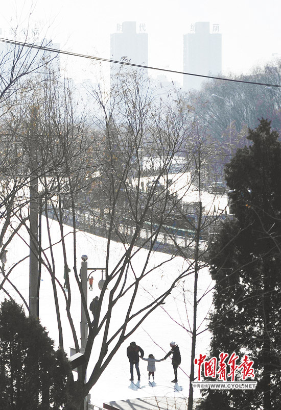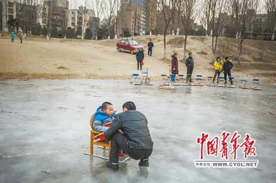 10日中午,北五环外东小口森林公园里,几片结了冰的水面上很热闹。这一带水域条件并不理想,长满了芦苇,面积也只能勉强算是小水塘。但对附近小区的居民来说,这几片冰场已属难得。冰场上,5岁的儿子正在朱先生怀里伤心地哭泣。来自浙江的朱先生在北京打工,他给儿子自制的小冰车由于底部的钉子太长,在冰上怎么也滑不远。这里30元一天的冰车租金价格已经和市中心的冰场持平,朱先生才自己动手给儿子做冰车的。围观者越来越多,孩子越哭越厉害。朱先生只好答应回去重新做一辆。父子俩早早地离开了公园。