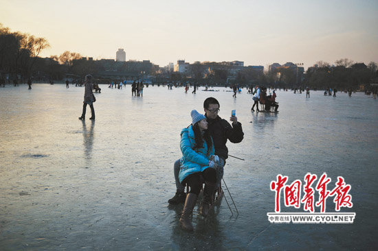 1月9日傍晚,什刹海公园北侧,一对情侣坐在冰车上拍照。