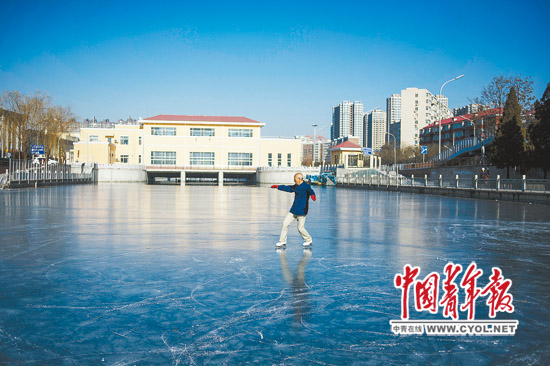 1月9日,护城河上,近70岁的尚大爷独自在冰面上“翩翩起舞”,他的身后就是放水的闸口。