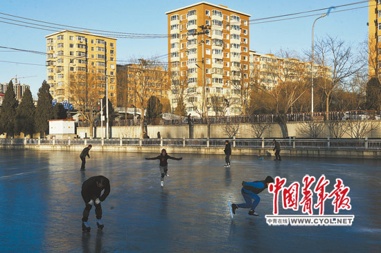 北京冬天能在室外滑冰的日子不长,一年里冰面平滑牢固的日子大概只有一个多月。北京什刹海冰场的工作人员介绍,夜间最低气温在-8℃以下,白天最高温度不超过1℃,这种温度持续一周冰才能冻瓷实。气温升高,冰面就“茬了”——这是玩冰人的说法,那样冰面开始皴裂,频频卡住冰刀,滑冰者就不得不离开冰面了。