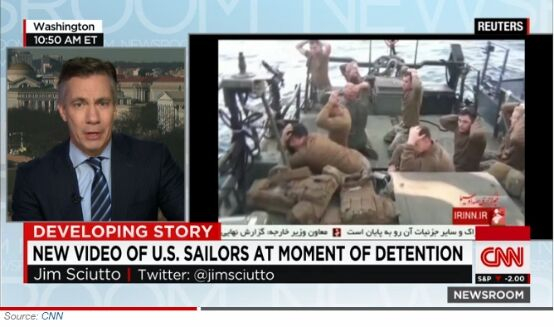 CNN主播说道:“从伊朗媒体公布的视频来看,美国士兵双手抱头、跪地。这不是一个好的画面。从视频中看,士兵的表情也并不开心。”