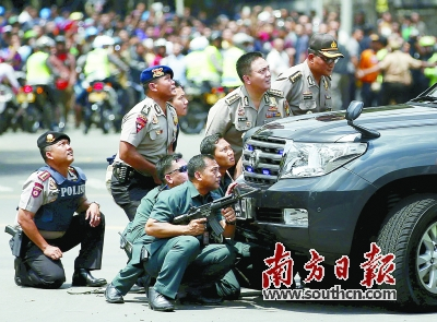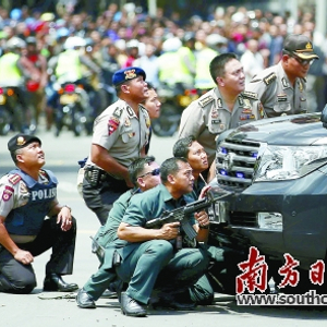 14日,在印度尼西亚首都雅加达,警察聚集在爆炸现场与袭击者对峙。新华社发