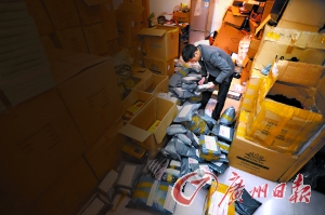 白云区沙太北路犀牛角村一家网店的工作人员在仓库里赶着发货。