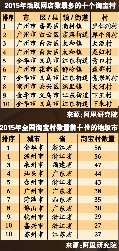 该报告统计了2015年活跃网店数最多的全国十大淘宝村。其中,广州的番禺区南村镇里仁洞村、白云区京溪街道犀牛角村、白云区太和镇大源村、白云区太和镇龙归村的活跃网店数位居全国前四位。其次,花都区狮岭镇益群村排第六位。