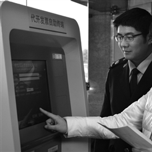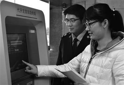 图为纳税人在税务干部的指导下使用自助办税终端开具增值税专用发票。翁晓宇/摄