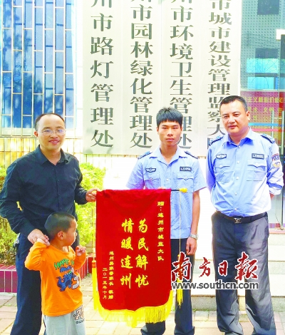 2015年10月23日晚,市民莫先生带着3岁的儿子到连州市文化广场玩耍,结果一转身儿子便不见了。惊出一身冷汗的他所幸遇到正在巡视的连州市城综局城监大队城监协管员祝懂杰。在得知莫先生的遭遇后,祝懂杰迅速加入并成功帮助莫先生找回了小孩。翌日,莫先生特地赠送锦旗致谢,并激动地表示:“感谢你们,帮我找回了儿子!”