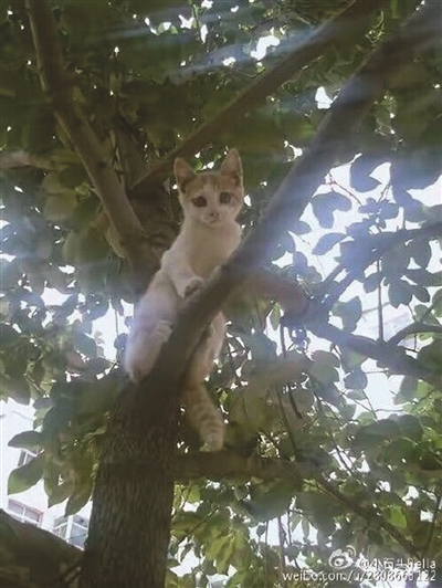 1月17日,南京江宁恒大绿洲小区的居民经过11栋时,突然听到一阵阵凄惨的猫叫声。居民四处寻找,侧耳细听,才发现声音是从旁边一棵大树上传来的,原来,大树顶上有一只黄白相间的小猫,距离地面有20米,小猫不敢下来。居民赶紧打119报警,请消防员前来救猫。但是小猫不偏不倚,正卡在树顶端的树杈里,角度比较不走运。消防员缺少合适的工具,只好无功而返,救援失败。