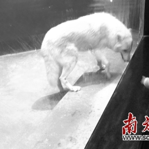 而在隔壁展位的北极狼则显得焦躁得多。面对围观的群众,北极狼显得十分不安,不断来回踱步。20平方米左右的空间,只有两根粗骨头和几截木棍。据场馆工作人员介绍,这个展位之前有两头狼,后来打架伤了一头。“还是不太熟悉环境”,他说。记者在北极狼展位前逗留的十分钟里,这匹白色的狼没有停止过踱步。“没人陪它玩”,旁边的一个小孩说。