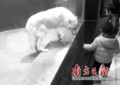 北极熊自己独享一个展位,但是并不活跃,只是偶尔抬头看一眼走过的游客,其他时间都眯着眼睛趴在地上。不过工作人员告诉记者,北极熊习性如此,不捕食的时候会显得比较慵懒。