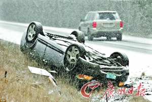 一辆车因路滑翻了。 一名乘客被困在机场。