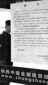 1月19日,华商报记者来到运营“中盛金服”平台的西安润金网络科技有限公司,该公司位于西安市高新区高新一路西部国际广场8楼。当天,华商报记者看到,公司入口的玻璃门上张贴着通告,上面写着1月12日公司发生了“派系争斗群殴事件”,有人“冲砸破坏公司财务、破坏电脑系统及客户资料”,公司有人“假造资历骗取高薪及入职空挂名”等情况,”公司有“311人属于非正规招聘,严令所有人员禁止进入公司办公场所”,“将在1月20日前聘任新的总经理及高层管理人员”。通告的落款方为西安润金网络科技有限公司,并盖有公司公章,通告时间为2016年1月15日。