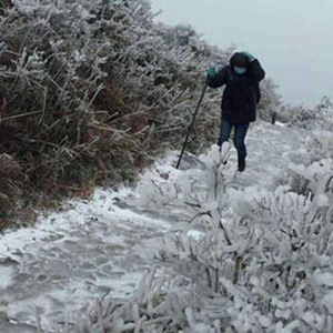 飞云顶上,23日出现冰挂,24日“冰挂”升级更为壮观,树上、草上的冰块更加明显了,面积更大。从分水坳到飞云顶的登山道上,更是结出了2至3厘米的冰。来自博罗的驴友自带温度计测得温度低至零下7度。银装素裹的景象仿佛将人带入了北国风光的景象。“我在罗浮山工作和生活了快30年还是第一次看到这样的景象。”同行的老黄说,“以前,飞云顶上也会结冰,但从未出现这么大面积的冰挂!”
