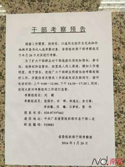 南都讯 记者张应昂广东省委组织部发布干部考察预告,珠海市长江凌同志拟作为交流担任地级市委书记人选考察对象,省委组织部干部考察组在今日(26日)对其进行考察。