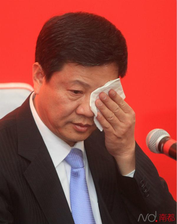 2012年1月11日,陈建华在市长记者招待会上哽咽落泪。(南都资料图片)