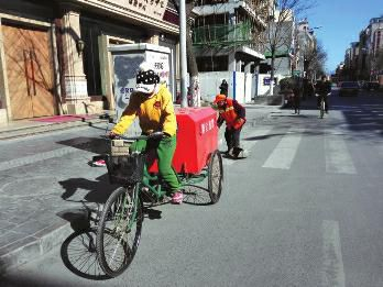 1月24日一早,经历连日的大风降温后,难得的阳光依然未能消解寒冷。上午9时许,安康城区气温-3℃,街上不时可见积冰。汉滨区安悦街上,一个小女孩骑着环卫车缓缓行驶,连同身后的老年环卫工人身影,一起投射在清冷的街道上。
