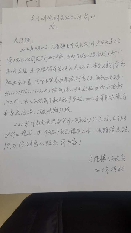 据报道,江西进贤县文港镇有民众向媒体反映,2014年11月21日,文港镇毛笔个体户徐财秀等人因故意毁坏其公司财物,被检察机关提起公诉。文港镇政府向县法院发出带有镇政府公章的公函,请求对徐从轻处罚。对此,文港镇时任党委书记称:发公函原因是考虑到犯罪嫌疑人的平时表现,经过集体研究决定。