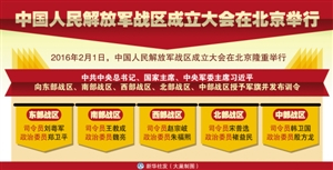 【新华社北京2月1日电】中国人民解放军战区成立大会1日在北京八一大楼隆重举行。中共中央总书记、国家主席、中央军委主席习近平向东部战区、南部战区、西部战区、北部战区、中部战区授予军旗并发布训令,强调建立东部战区、南部战区、西部战区、北部战区、中部战区,组建战区联合作战指挥机构,是党中央和中央军委着眼实现中国梦强军梦作出的战略决策,是全面实施改革强军战略的标志性举措,是构建我军联合作战体系的历史性进展,对确保我军能打仗、打胜仗,有效维护国家安全,具有重大而深远的意义。