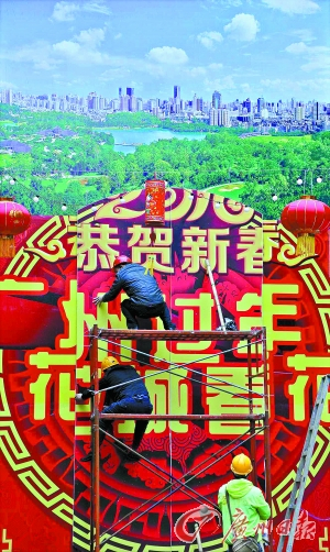 工人们正搭建西湖路越秀花市棚架。广州日报记者黎旭阳摄