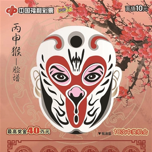 该票种是特意为猴年设计的节日主题彩票,画面以中华传统民间艺术——脸谱作为设计主体元素,加入被古今赞扬的梅、兰、竹、菊等作为衬托,并运用水墨山水画修饰,画面唯美,独具创意,体现出中国民间艺术非常深厚的文化底蕴。其玩法采用畅销的“数字比对式+固定图符”玩法,更有10倍奖金的惊喜,最高奖金为40万元。