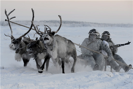 当地时间2016年2月1日,俄罗斯摩尔曼斯克,北方舰队的北极机械化步兵旅举行军事演习,学习控制狗拉雪橇和驯鹿雪橇。视觉中国供图