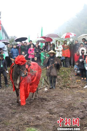 中新网衢州2月4日电(记者 李佳赟)2月4日,伴着老农的一声吆喝,身披红色绸布的“春牛”走向田间,在结实的土地中犁开深深的一道沟,开始了新春的第一耕。2月4日正值农历节气“立春”,在浙江省衢州市柯城区九华乡妙源村,人们依旧延续着隆重而古老的“立春祭”仪式,祭春神、敬土地、鞭春牛……传统的华夏农耕文明在这里获得现世传承。