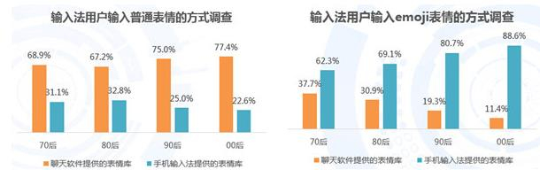 iiMedia Research(艾媒咨询)数据显示,使用聊天软件时,各年龄层手机输入法用户主要是通过聊天软件提供的表情库这一方式输入普通表情,但输入emoji表情则主要是通过输入法提供的表情库输入的,表明各年龄层手机输入法用户输入两种表情的方式都存在显著差异。艾媒咨询分析师认为,市场上的输入法产品都能够提供两种表情,但用户更多地依赖于输入法产品输入emoji表情,因此输入法产品在emoji表情方面的改进更容易让用户感知。