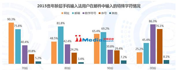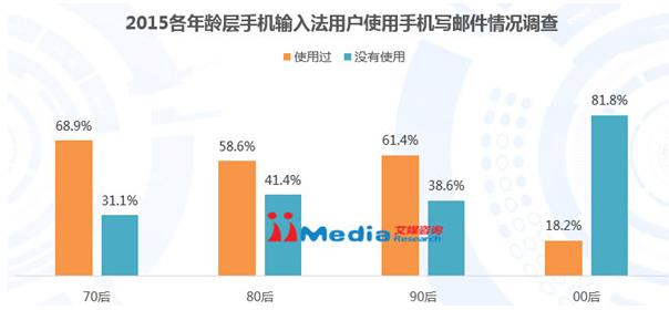 iiMedia Research(艾媒咨询)数据显示,2015年70后、80后、90后和00后手机输入法用户中利用手机写邮件的比例分别为,68.9%、58.6%、61.4%和18.2%,表明在70后、80后和90后手机输入法用户中有较多的人写邮件,而00后用户中则比较少。艾媒咨询分析师认为,写邮件时经常需要输入一些特殊字符,比如网址,邮箱,数学符号,序号等,而且对输入的精确性有较高的要求,输入法产品在键盘布局、特殊词库等方面应兼顾用户的此类需求。