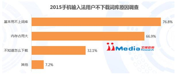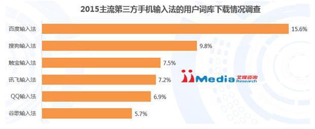 iiMedia Research(艾媒咨询)数据显示,2015百度输入法、搜狗输入法、触宝输入法、讯飞输入法、QQ输入法和谷歌输入法等产品的用户中下载词库的比例分别为15.6%、9.8%、7.5%、7.2%、6.9%和5.7%,表明各主流第三方输入法产品的用户下载词库的比例均比较低,但百度输入法高于其他输入法。通过对百度输入法开发人员进行深入访谈,艾媒咨询师了解到,他们在开发词库时追求精小,词库占用内存小但准确性却没有下降,而这种轻模式最终也得到了更多用户的认可。