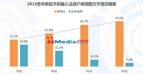 iiMedia Research(艾媒咨询)数据显示,2015年70后、 80后、90后和00后手机输入法用户中使用颜文字的用户比例为,55.2%、67.8%、85.7%和92.6%,表明用户越年轻使用颜文字的用户比例越高。艾媒咨询分析师认为,颜文字应用更受年轻用户喜爱,输入法产品在开发颜文字时应更多地关注年轻用户的兴趣点、交流热点,及时开发出契合年轻人需求的颜文字。