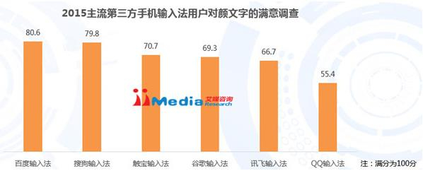 iiMedia Research(艾媒咨询)数据显示,2015年百度输入法,搜狗输入法、谷歌输入法、讯飞输入法、触宝输入法和QQ输入法等产品的用户对输入法提供的颜文字的满意评分平均为80.6分、79.8分、70.7分、69.3分、66.7分和55.4分 ,表明用户对输入法的颜文字大体满意,其中满意评分最高的是百度输入法。通过对百度输入法用户进行深入访谈,艾媒咨询师认为,百度输入法颜文字凭借种类多、联想快、内存占用小等多方面的优点带给用户更好的使用体验。