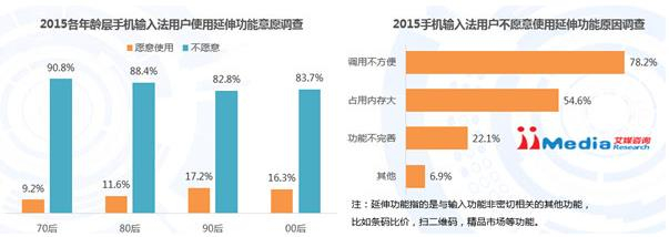 iiMedia Research(艾媒咨询)数据显示,2015年70后、 80后、90后和00后手机输入法用户中愿意使用输入法延伸功能的比例分别为9.2%、11.6%、17.2%和16.3%,表明各年龄层手机输入法用户使用延伸功能的意愿普遍偏低,而90后和00后的年轻用户愿意使用的比例略高于70后和80后用户。“调用不方便”和“占用内存大”是不愿意使用的主要原因,分别为78.2%和54.6%。艾媒咨询分析师认为,输入法作为一款工具性产品,用户主要关注它的输入功能,如何更快,更准确和更有趣地为用户提供服务才是各输入法产品需要重点解决的问题。