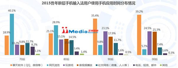 iiMedia Research(艾媒咨询)数据显示,2015年70后和80后手机输入法用户用于网页浏览时间最多,分别为40.1%和28.9%;90后和00后用于聊天软件的时间最多,分别为35.4%和39.2%,表明90后、00后年轻用户与70后、80后用户偏好存在较大的差异。艾媒咨询分析师认为,聊天软件应用相较于网页浏览会更多地使用到手机输入法,因此年轻用户更在意手机输入法产品的使用体验。
