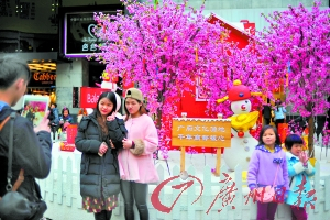 广州北京路,市民在鲜花布景前留影。广州日报记者 廖雪明 摄