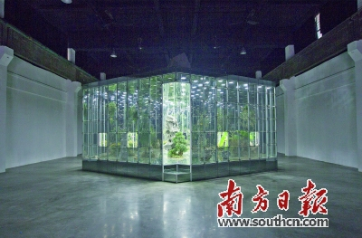 如果说《以形而上的方式诞生》象征着死亡,那么《诺亚花园》则给观众带来一丝“生机”。取名自“诺亚方舟”古老寓言的《诺亚花园》,是一座六边镜面体的“温室花园”。封闭的玻璃屋内被区分为六个功能空间,摆放着富有传统文人趣味的梅兰竹菊、瓜果藤蔓或奇石假山。每一片镜面都与植物相互映射,展现出万花筒般的奇异景象。