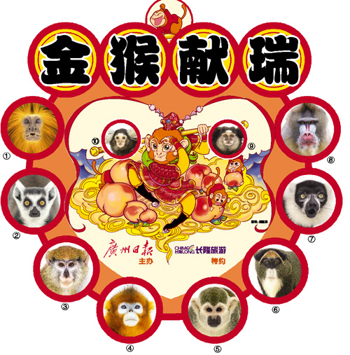 方式:拍照集齐广州日报“金猴献瑞”图中真猴中的9种猴子,并分享至朋友圈(需提及“长隆野生动物世界”或显示地理位置),凭朋友圈截图即可在南门或北门的客服中心领取特色纪念品一份。