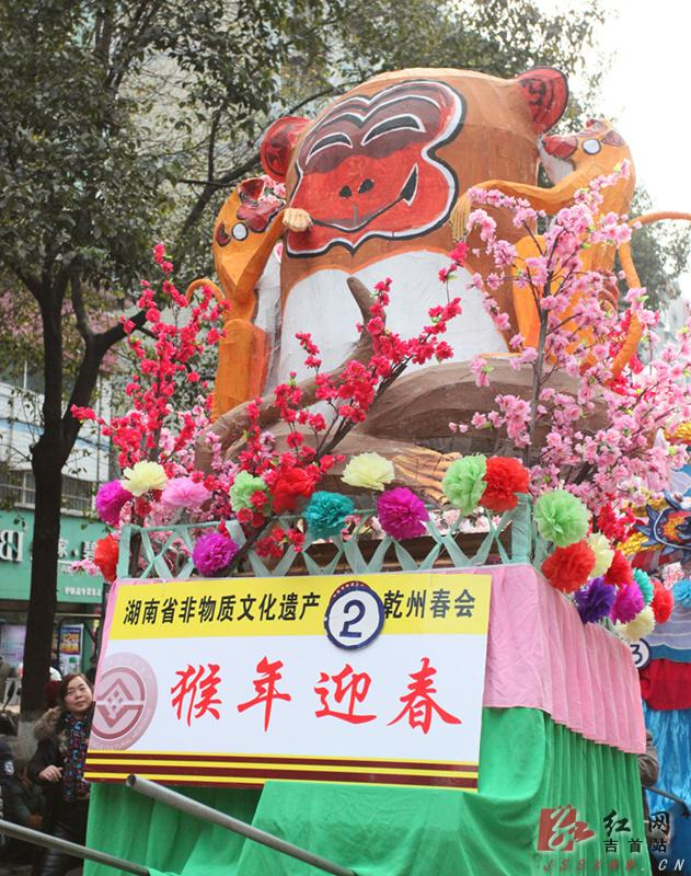 红网吉首站2月10日讯(分站记者 肖庆宾 张魏) 金猴正坐中央,两只橘色猴宝宝分列左右,画面温馨生动,一派其乐融融场景。2月10日,一座高两米重40余斤“福寿双至”春台亮相“神秘湘西·吉周吉年”大型非物质文化遗产“游春”活动。“咦,这台春不就是黄永玉今年设计的猴票嘛?”早有眼尖的游客发现其中奥秘,嘴里不住地喊“像”,然后笑着给旁人介绍“这台春好,不仅象征亲情,还寄托着阖家团圆、福寿双至的寓意。”正月游春,是湘西州府吉首特有的传统年俗,已有数百年历史。