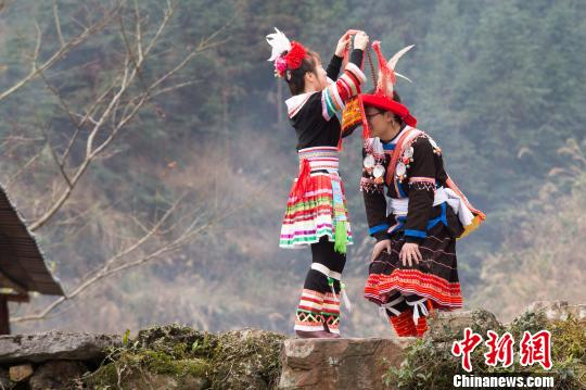 2月10日,表白成功的阿贵哥和莎腰妹在情人桥上交换信物。当日,首届瑶族(油岭)玩坡节在清远市连南油岭举行。 李思靖 摄